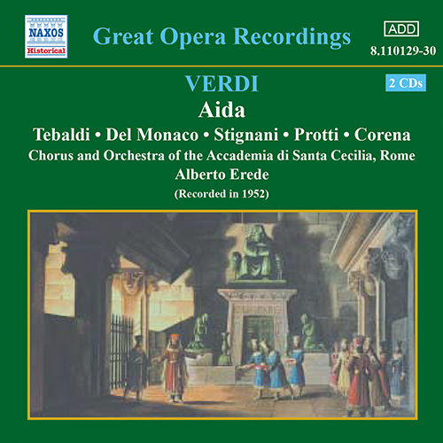 Made in Rome in July 1952, a year after the equally acclaimed La bohème (Naxos 8.110252–53) and Madama Butterfly (Naxos 8.110254–55), this recording features a dazzling array of some of the finest Italian singers. The great, peerless lirico spinto soprano, Renata Tebaldi is here partnered for the first time with the tenor, Mario del Monaco, who possessed one of the most thrilling and powerful natural voices. They are arguably in fresher voice than in their later stereo remake. The finest Italian mezzo-soprano of her generation, Ebe Stignani is fondly remembered for her stage appearances with Maria Callas in Norma and Callas and Jussi Björling in Il trovatore.