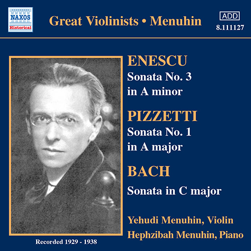 This fifth volume in the Naxos series of 78rpm sonata recordings by Yehudi Menuhin focuses on the great violinist’s constant quest for performing new music. It was natural that Menuhin should be drawn to the best-known work for violin by his teacher George Enescu, the Sonata No. 3 ‘in the Romanian folk style’, recorded in Paris in 1932 with the composer in attendance. The 1918–19 Sonata by Ildebrando Pizzetti, one of the major hopes of Italian music, was an even more enterprising choice, especially for a recording. As Menuhin never had the opportunity to record it again, this 1938 performance has great rarity value. The recording of the solo Bach Sonata is an amazing reminder of how well Menuhin could play Bach at 13.