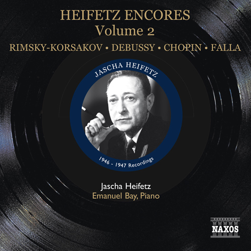 Over four days of sessions in Hollywood during 1946 and 1947, Jascha Heifetz and his regular accompanist Emanuel Bay recorded this evocative series of encores. The repertoire was wide-ranging, and included three Spanish pieces by Sarasate, Nin and Ernesto Halffter, all delectably played, in his only recordings of them. He turned also to his own transcription of Bax’s Mediterranean as well as to staples such as Rimsky-Korsakov’s dazzling Flight of The Bumble-Bee. Throughout, Heifetz’s bowing, pizzicati, double stops, glissandi and inimitable portamenti grace these pieces with incredible freshness.