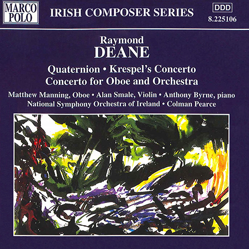 One of Ireland’s leading composers, Raymond Deane is here represented by three re-interpretations of the traditional concerto. Quaternion explores different relationships of keyboard and orchestra, Krespel’s Concerto is based on a tale of Hoffmann and the Oboe Concerto dramatises the soloist as an exiled outsider.