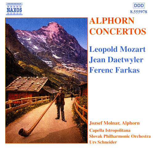 Although the alphorn is limited by its size and range, it may come as a surprise that works exist for this unusual instrument with orchestra. Leopold Mozart, father of Wolfgang, composed a number of concertante works for instruments not usually associated with the orchestra, and his deftly-constructed Sinfonia Pastorella exhibits a charm all of its own. The remaining three works were all written closer to our own time, the Dialogue and Concerto by Daetwyler exploiting the characteristics of the alphorn to evoke the relationship between man and nature, and the Farkas Concertino a brief essay making clever use of the richness of the instrument’s timbre.
