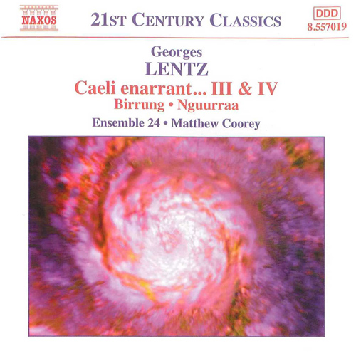 Georges Lentz’s large and ongoing cycle of works “Caeli enarrant…”, written for various combinations of string instruments, percussion and woodwind, reflects the composer’s fascination with astronomy as well as his spiritual beliefs, questions and doubts. Born in Luxembourg, but an Australian resident since 1990, Georges Lentz has developed a highly idiosyncratic musical language which succeeds in communicating deeply held convictions about the nature of the universe. Lentz’s craftsmanship, always of the highest level, is wholly at the service of the spiritual programme which pervades his entire output. The bold gestures of two pieces from the early 1990s are in marked contrast to the serenity of the more recent works Birrung and Nguurraa.