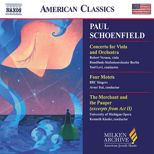 Celebrating the richness of traditional Jewish melodies, dances, and folklore, the music of Paul Schoenfield has at the same time been embraced by the world’s leading orchestras, conductors, and soloists. These WORLD PREMIERE RECORDINGS include the Concerto for Viola and Orchestra, commissioned/debuted by Robert Vernon (principal violist of the Cleveland Orchestra); the hauntingly beautiful Four Motets; and scenes from the mystical opera The Merchant and the Pauper, in which a supremely beautiful maiden stranded on an island wilderness is reunited with her betrothed-an allegory of the Jewish people and God, as related in an old Hassidic tale.