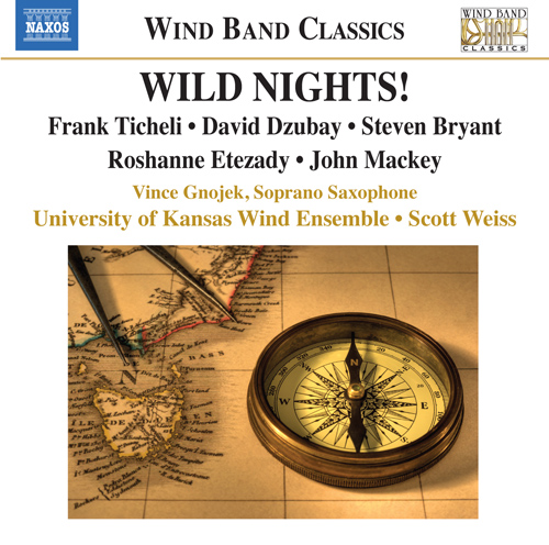 The University of Kansas Wind Ensemble offers musically enriching and artistically outstanding performances of the finest wind band repertoire. Following Redline Tango (8.570074), the Ensemble here presents a diverse selection of 21st-century music which takes its name from multi-award-winning Ticheli`s exuberant Wild Nights! Mackey`s Soprano Saxophone Concerto pays tribute to his teacher Corigliano`s Clarinet Concerto, the instrumentation of its inner movements matching their titles: ‘Felt’, ‘Metal’ and ‘Wood’. Etezady`s Anahita was inspired by William Morris Hunt`s depiction of the beautiful and terrifying Zoroastrian night goddess, Dzubay`s Shadow Dance elaborates on Pérotin’s famous medieval organum Viderunt Omnes, while Bryant’s chorale-like Dusk is illuminated by the fiery hues of sunset.