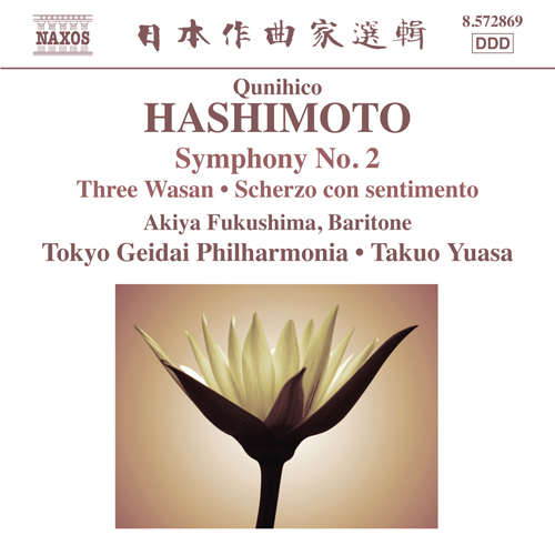 Qunihico Hashimoto was one of the leading Japanese composers in the first half of the twentieth century. His synthesis of Japanese and European musical forms was founded on two years of study and travel in the West. Symphony No 2 was commissioned to celebrate Japan’s new postwar Constitution, but combines jubilation with an introspective nostalgia. Three Wasan sets Buddhist texts which describe the beauty of ‘pure land’ or heaven, merging traditional chant with bel canto expressiveness. Innovative for its time, the early Scherzo con sentimento melds Japanese music with Western neo-classicism. Hashimoto’s Symphony No 1 can be heard on 8.555881.