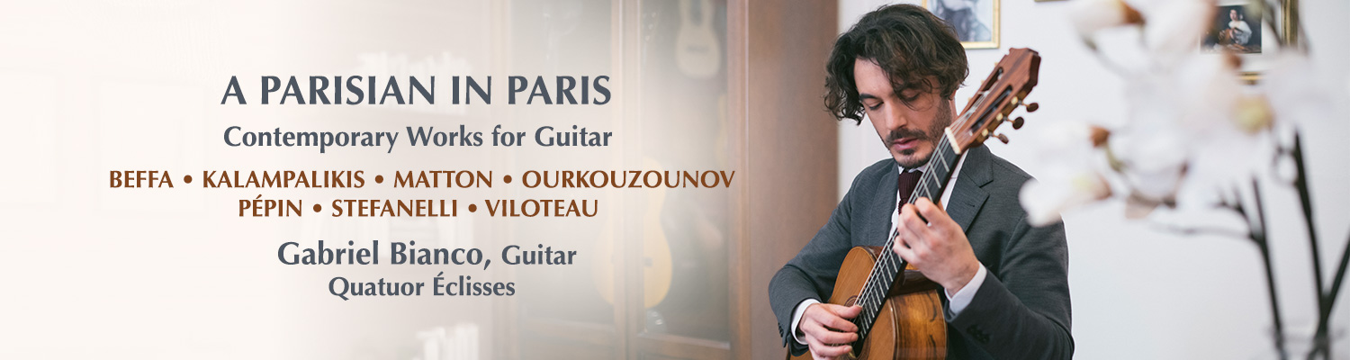 Gabriel Bianco, Guitar • Quatuor ÉclissesThis album presents a diverse selection of world premieres commissioned by the award-winning guitarist, Gabriel Bianco, from composers who have lived and worked in his native Paris. These range from the swirling Spanish motifs in Matthieu Stefanelli’s Ellipsis for four guitars, featuring the Quatuor Éclisses, to Camille Pépin’s hypnotic Autumn Rhythm and Thomas Viloteau’s festive A Night in Bastille – just a few of the highlights in this programme of new guitar music from the City of Light.
