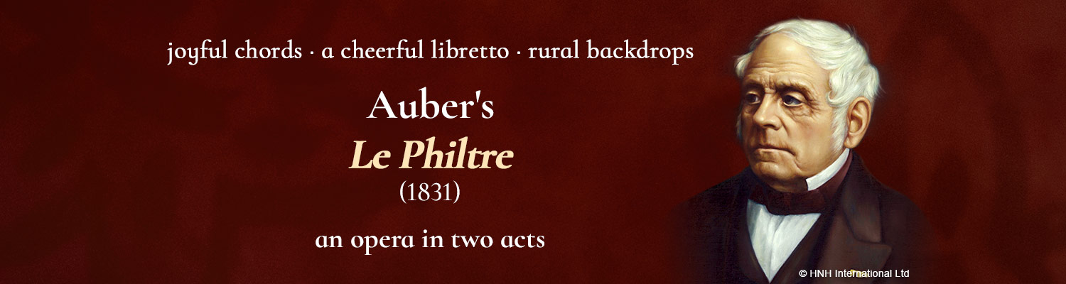 The two leading operatic composers of their time were Rossini and Auber, one now fêted, the other largely overlooked. In 1831 Auber and his long-standing librettist Eugène Scribe produced Le Philtre, which took the concept of petit opéra to the extreme, even outdoing Rossini’s Le Comte Ory in depicting a rural setting peopled not with Arcadian shepherds but with ordinary country folk. Auber’s Franco-Italian style can be heard in the work’s ensembles, while elsewhere the opera shimmers with rich arias, buffo elements and delightful cavatinas. Le Philtre was an unalloyed success receiving 243 performances and inspired Donizetti’s L’elisir d’amore.