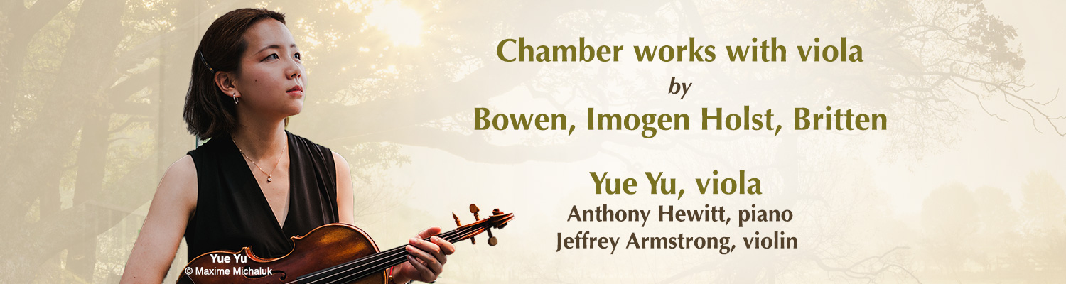 Yue Yu, Viola • Jeffrey Armstrong, Violin • Anthony Hewitt, PianoAn accomplished horn and viola player, York Bowen is said to have preferred the tone of the viola to the violin. Inspired by the virtuosity and vibrato style of the distinguished violist, Lionel Tertis, Bowen wrote several works for him and became his accompanist. Bowen’s subtle shifts of key and heartfelt melodies are well in evidence here, including the powerful and poised Rhapsody, Op. 149, considered to be one of his most important works. Gustav Holst’s daughter Imogen is represented here by the open-air freshness of her Four Easy Pieces and the terse, laconic narrative of her Duo for Viola and Piano. Britten’s spiky Waltz is full of 1930s wit.