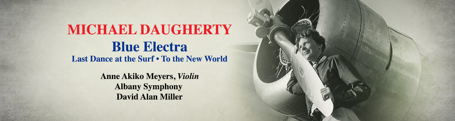 This recording showcases three new evocative works by GRAMMY Award-winning American composer Michael Daugherty, exploring the triumphs and tragedies of flight. Blue Electra is a dramatic violin concerto inspired by the sensational life and mysterious disappearance of aviation pioneer Amelia Earhart in 1937. Last Dance at the Surf is a one-movement dance symphony for orchestra that reflects upon rock ’n roll legend Buddy Holly’s final performance in 1959 at the Surf Ballroom in Iowa and his tragic death in a plane crash just hours after his show. To the New World for orchestra celebrates the triumphant Apollo 11 moon mission in 1969 and Neil Armstrong’s historic moonwalk. Under the baton of GRAMMY Award-winning conductor David Alan Miller, the Albany Symphony is joined by GRAMMY Award-winning violinist Anne Akiko Meyers, who performs Blue Electra with electrifying musicality and emotion.