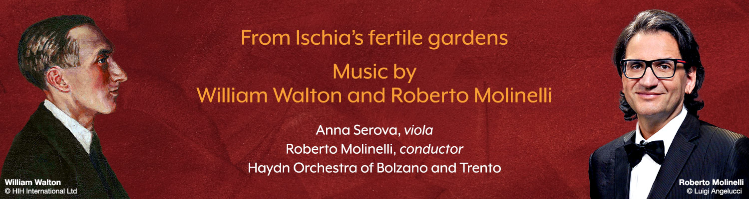 With his distinctive blend of incisive drama and lyrical expressiveness, Sir William Walton was one of the greatest English composers of the 20th century. He and his wife Susana made their home on the Italian island of Ischia where he composed the Cello Concerto – a work he considered to be the best of his three concertos for string instruments – heard here for the first time in a stunning transcription for viola by Anna Serova. The Italian composer Roberto Molinelli pays homage to Susana’s Argentine roots and the beautiful garden she created, La Mortella, with his concerto Lady Walton’s Garden, displaying a colourful use of South American and Neapolitan instruments. William’s Rock and The Missing E are also dedicated to La Mortella.