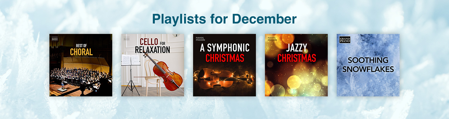 Looking for new music? Our selection of curated playlists has you covered with music to complement the season, moment, or activity! This month from Naxos, discover some of the most beautiful choral works ever written in Best of Choral, and immerse yourself in tranquil cello melodies with Cello for Relaxation. Then from Naxos Moods, ring in the holiday season with orchestral arrangements of Christmas classics in A Symphonic Christmas, and add a dash of Nordic Jazz to your season’s greetings with Jazzy Christmas. Lastly, find serenity with the soft piano notes in Grand Piano’s new playlist, like snowflakes in peaceful moments. Happy listening!