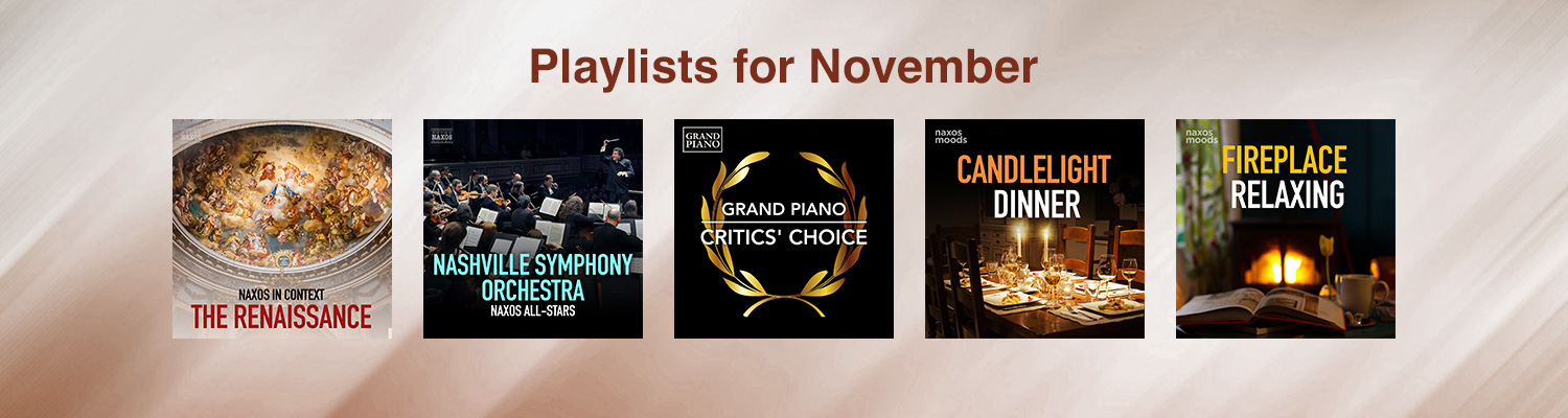 Looking for new music? Our selection of curated playlists has you covered with music to complement the season, moment, or activity! This month from Naxos, explore early classical music with the Naxos in Context: Renaissance Era playlist and dive into the Nashville Symphony Orchestra’s discography with the Naxos All-Stars: Nashville Symphony Orchestra playlist. Then, enjoy the Grand Piano Critics’ Choice playlist, featuring works that have received prestigious accolades. Finally, from Naxos Moods, enjoy ambient harmonies with the Candlelight Dinner playlist, and unwind to beautiful classical music with the Fireplace Relaxing playlist. Happy listening!