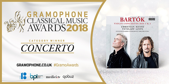 This year's Gramophone Classical Music Awards gala took place on September 13 in London. Ondine’s recording of Bartók's First and Second Violin Concertos (ODE1317-2) with Christian Tetzlaff, Hannu Lintu and the Finnish Radio Symphony Orchestra won the Concerto award.
