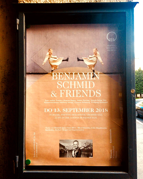 On September 13, Benjamin Schmid celebrated his 50th birthday with a gala concert at the Great Hall of the Salzburg Mozarteum Foundation. He joined forces with Lars Anders Tomter, Clemens Hagen, Ariane Haering, Wolfgang Mutspiel and Florian Eggner, presenting an impressive programme that included works from solo to orchestral by Biber, Schnittke, Mendelssohn and Berger, as well as jazz improvisations.