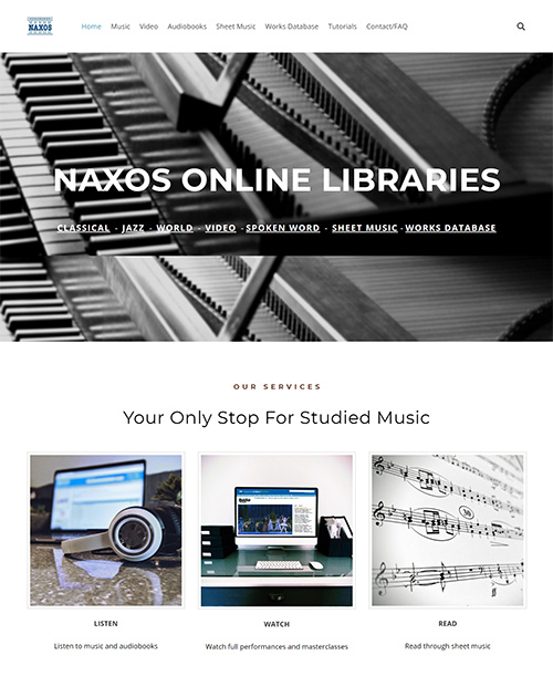 Naxos Online Libraries are collections of "studied music", presented as streaming subscription services that are available to institutions and individuals. Complete with educational resources, administrator features, free MARC records, and mobile applications, NOL is quickly becoming the go-to music resource for colleges, public libraries, professional music organisations, and many more. Subscribe to whichever collections you want and pay only for the number of users that you need, based on audience size. With no track limits or time limits, users can listen, watch and read all day long. While music is our forte, we also offer audiobook streaming and online sheet music.