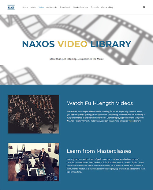 More full-length videos? NaxosVideoLibrary.com brings you an extensive streaming video library of classical music performances, opera, ballet, live concerts and documentaries. Watch the world's greatest opera houses, ballet companies, orchestras and artists perform on demand! NaxosVideoLibrary.com offers over 2,800 full-length videos, accessible anytime, anywhere.