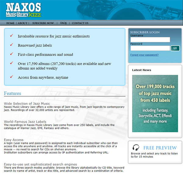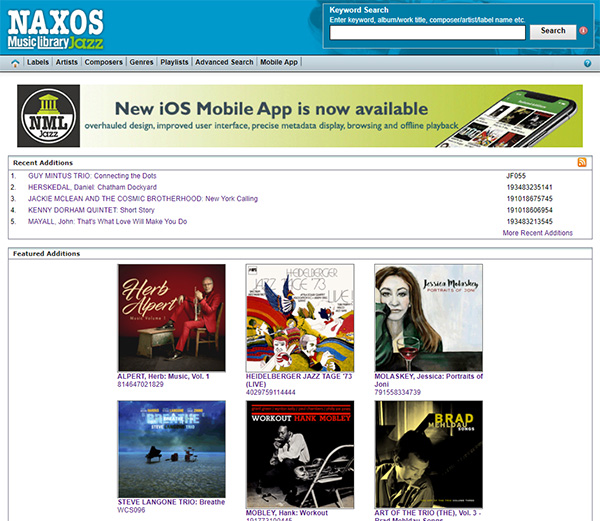 Naxos Music Library Jazz is one of the most comprehensive collections of jazz music available online. It offers over 207,000 tracks from more than 17,500 albums. It boasts a wide range of jazz music, from jazz legends to contemporary jazz. Recordings of over 32,000 artists are represented. Naxos Music Library Jazz comprises the catalogues of over 250 labels, including Warner Jazz, EMI, Fantasy and others.
