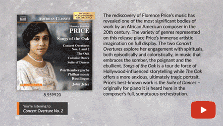 The rediscovery of Florence Price’s music has revealed one of the most significant bodies of work by an African American composer in the 20th century. The variety of genres represented on this release place Price’s immense artistic imagination on full display. The two Concert Overtures explore her engagement with spirituals, both episodically and coloristically, in music that embraces the somber, the poignant and the ebullient. Songs of the Oak is a tour de force of Hollywood-influenced storytelling while The Oak offers a more anxious, ultimately tragic portrait. Price’s best-known work is the Suite of Dances – originally for piano it is heard here in the composer’s full, sumptuous orchestration.