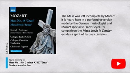 This second album of Mozart’s complete Masses (Volume 1 is on 8.574270) pairs one work of exceptional dimensions and ambition with a miniature example. The ‘Great’ Mass in C minor is one of Mozart’s most spectacular and cast on such a scale that it embraces every human and spiritual emotion, reconciling the Salzburg tradition with that of Italian opera. The Mass was left incomplete by Mozart – it is heard here in a performing version made by the German musicologist and Mozart specialist Franz Beyer. By comparison the Missa brevis in C major exudes a spirit of festive concision.